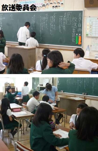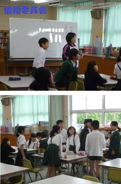 委員会活動は、5、6年生が7つの委員会に分かれて所属し、活動していきます。情報委員会は新しく来られた先生を特集した壁新聞の制作計画を立てていました。集会委員会は集会の企画を、放送委員会は放送のシナリオ作りをしていました。