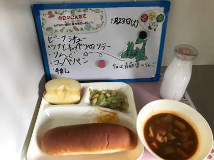 今日の献立:ビーフシチュー、ツナとキャベツのソテー、りんご、コッペパン、マーマレード、牛乳