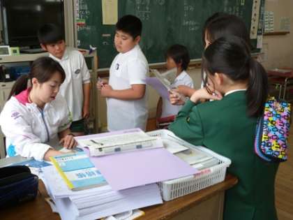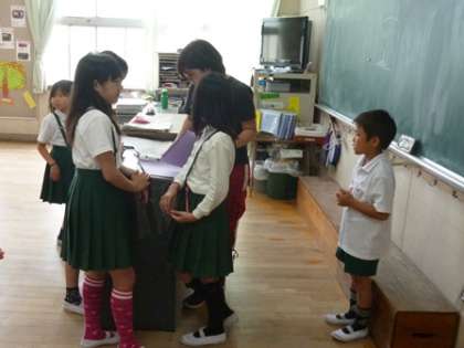 給食終了後、6年生がたてわり班の担当の先生と水曜日に行われるたてわり清掃話し合いに向けて、相談をしていました。