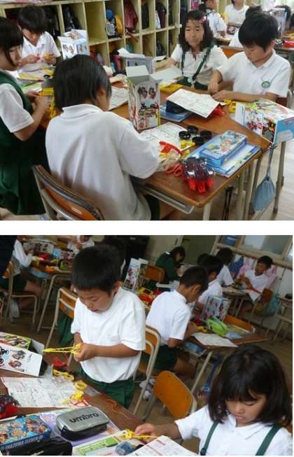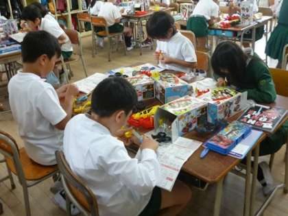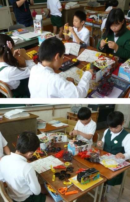 4年生が理科「電気のはたらき」の学習で乾電池(光電池)で走る自動車を作っていました。説明書をよく見て、必要な部品を組み合わせてモーターを組み立てていました。みんなとっても嬉しそうなわくわくした顔で作っていました。