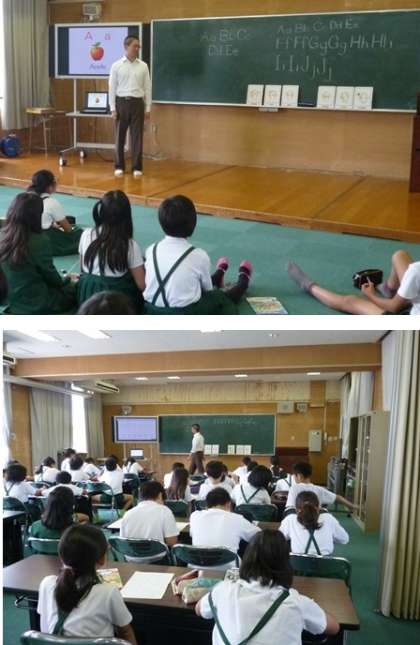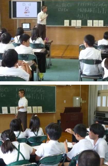 外国語活動の様子です。C−NETのエディー先生とアルファベットを書く練習をした後、フォニックス(発音練習)をしていました。