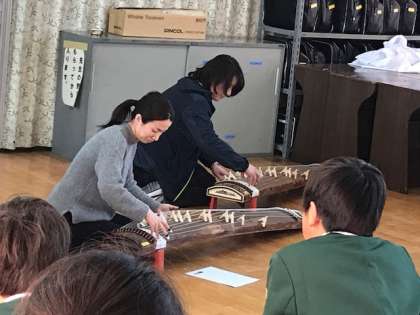 音楽の時間に「さくら さくら」を学習しました。日本の旋律を感じるために箏の音色を聴きました。先生二人が演奏し終わると大きな拍手が起きました。日本古来の楽器「箏」に興味を持つことができました。
