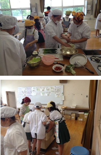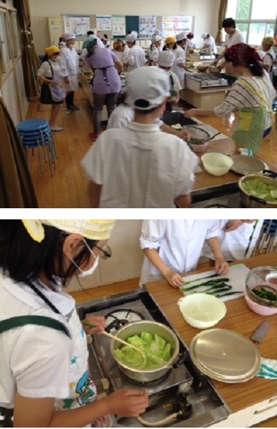 5年生が調理実習で、「ゆでたまご」と「ほうれんそうのおひたし」「ゆで野菜サラダ」を作りました。