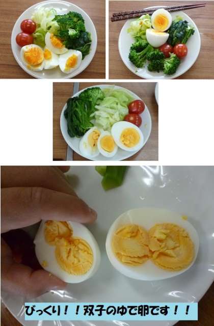 出来上がった、野菜サラダを写真にとっていると珍しい卵黄が2個のゆで卵を発見しました!!\(^o^)/