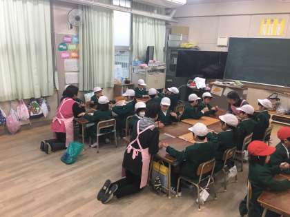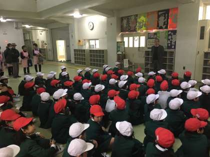 1年生が地域の方から昔遊びを教えてもらいました。こまやけん玉、お手玉、あやとり、折り紙、竹返しの6つの遊びを順番に回りながら遊び方を教えてもらいました。はじめはうまくできなかったことも、遊び方を丁寧に教えて貰い、できるようになりました。みんな大満足です。