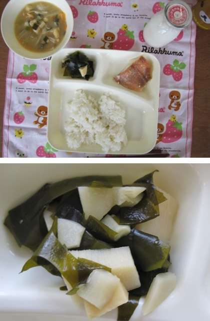 今日の給食は、わかめとたけのこを一緒に煮た「わかたけ煮」です。たけのこを「使った代表的な献立の一つです。