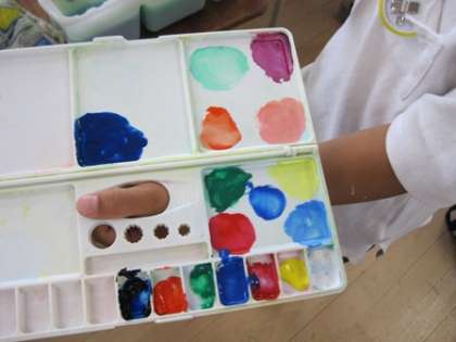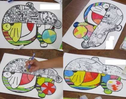 上手に色づくりをしてドラえもんに色をぬることができました。パレットには、きれいな色の丸がいっぱいできていました。カラフルなドラえもんの勢ぞろいです。