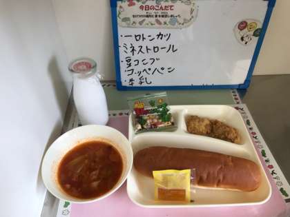 今日の献立:一口トンカツ、ミネストローネ、豆こんぶ、コッペパン、アプリコットジャム、牛乳