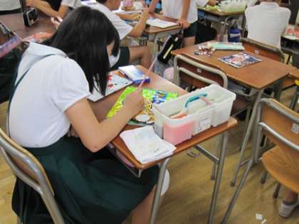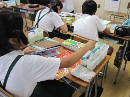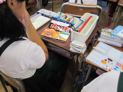 6年生が図工で「そっくりお菓子袋」を作っていました。お菓子の袋の一部を書き換えています。