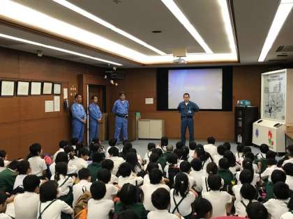 4年生は、本日午前中に焼却工場の見学に行きました。鶴見緑地を通り過ぎて約40分の道のりでした。焼却工場の煙突は、遠くからでもよく見えました。
