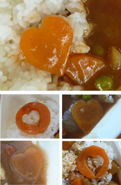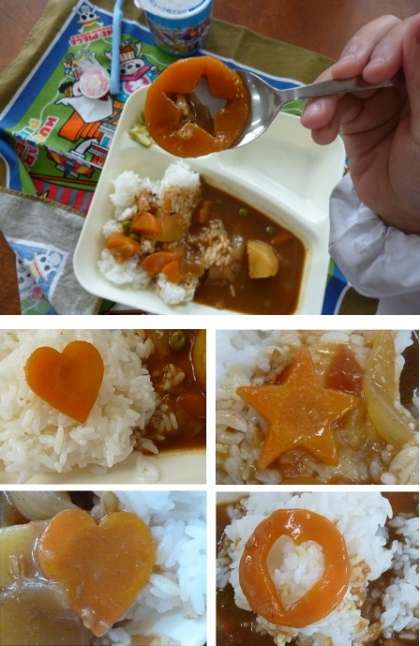 今日の給食チキンカレーにハートと星の形ぬきをしたにんじんが各学級で数人だけに入っていました。