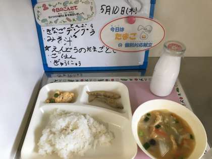 今日の献立:きびなごてんぷら、みそ汁、えんどうの卵とじ(卵の個別対応献立)、ごはん、牛乳