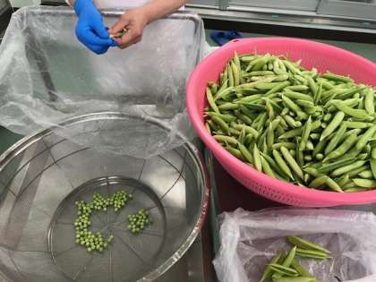 えんどうの卵とじは、給食室で生のさやをむいています。だしがきいていてとてもおいしかったです。