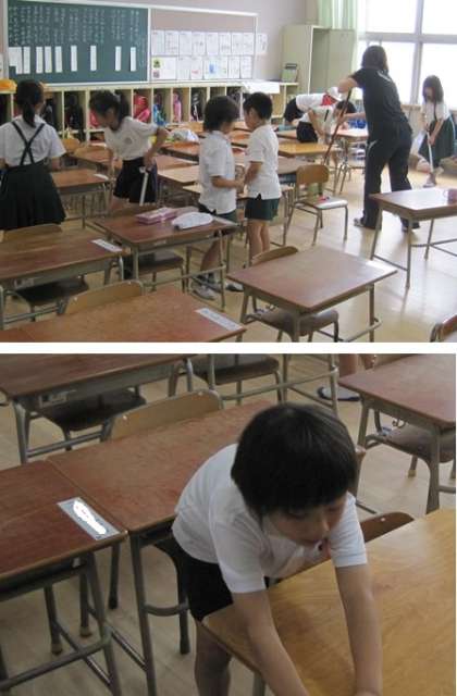 校舎のあちこちで、低学年と仲良くそうじをしながら、そうじの仕方を教えている高学年児童の姿が見られました。