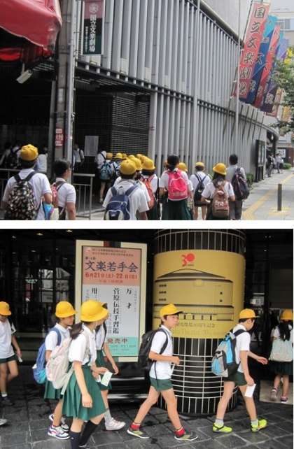 6年生が国立文楽劇場まで行って、文楽教室を受けてきました。
