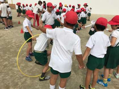 今回の児童集会は、フラフープくぐりでした。たて割り班で協力してゲームを楽しみました。