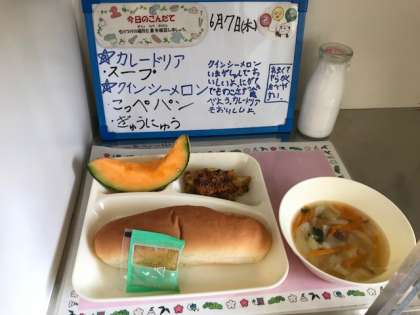 今日の献立:カレードリア、スープ、クインシーメロン、コッペパン、リンゴジャム、牛乳