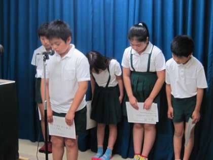 集会委員会の児童は、マイクの前ではっきりした声でわかりやすく問題を読み上げていました。