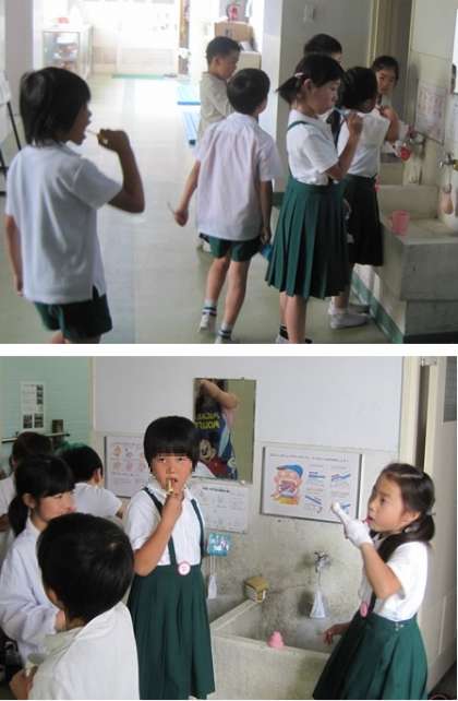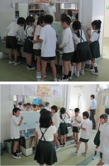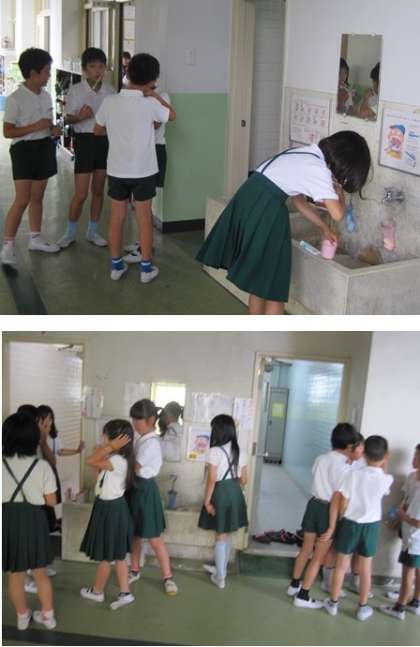 写真、給食後の歯みがきをしている児童たち。