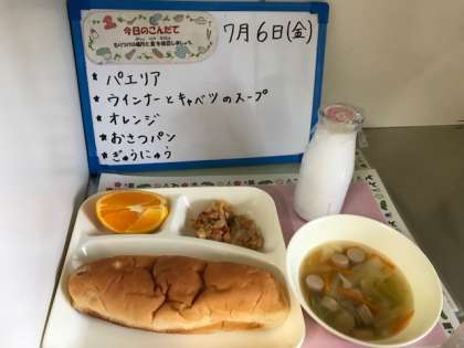 今日の献立:パエリア、ウインナーとキャベツのスープ、オレンジ、おさつパン、牛乳