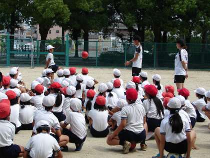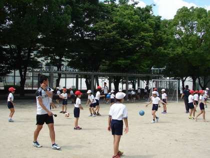 運動場北側 第二グランドにて セレッソ大阪による「夢・授業」でサッカーを教えていただきました。暑い日でしたが、ボールキックの練習から始まり、ボールの取り合い、コーチと試合、クラス同士で試合をするなど、熱く盛り上がり楽しい2時間を過ごしました。