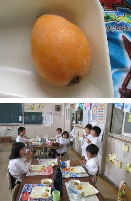 ある程度食べなれている児童は大丈夫でしたが、低学年の児童の中には、どうやって食べていいか分からなくてとまどっている児童もいました。「びわ」は季節が限定された果物で食べた経験がない児童が多いからですね。いろいろ種類の食材をたべる経験をさせることも食育になるのだなぁ。。。と思いました。