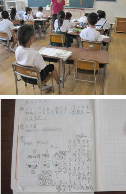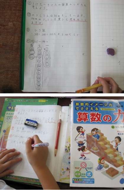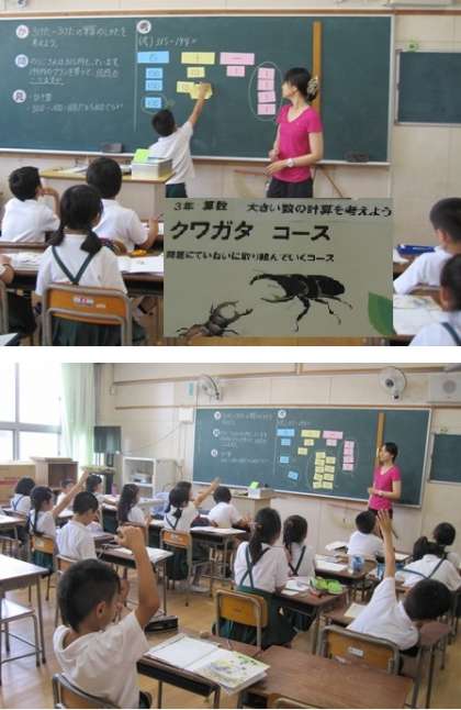 3年生の算数の学習の様子です。「大きい数の計算を考えよう」という単元で、3つのコースに分かれて学習しています。事前テストを行いその結果元に、児童が希望したコースで学習しています。