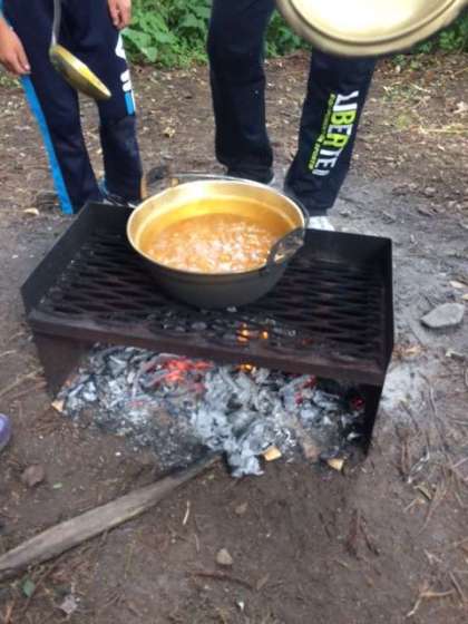 今日の昼食は飯盒炊爨(はんごうすいさん)でご飯を炊いて、カレーライスを作りました。