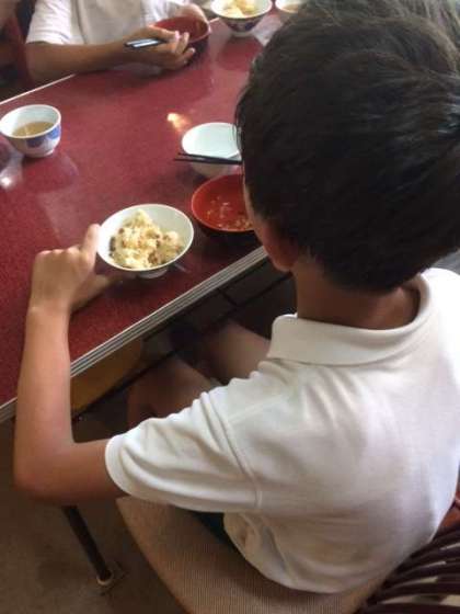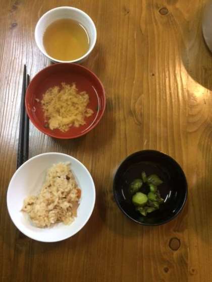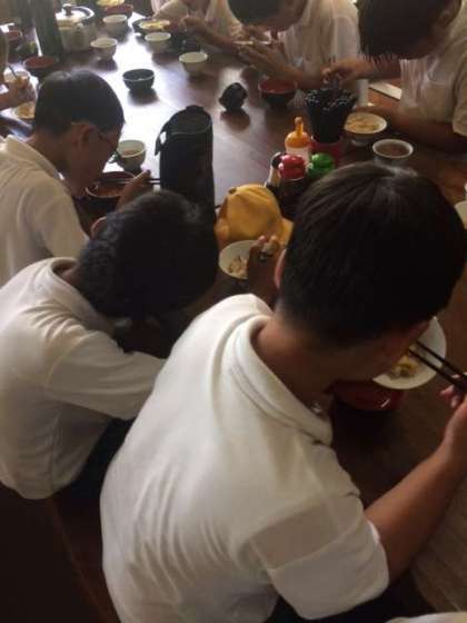 お餅を食べ、高原散歩の後は、お昼ご飯を食べました。メニューは炊き込みご飯とお吸い物です。