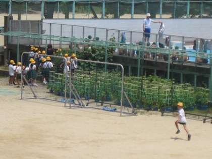 プールの横の学習園で2年生が生活科で育てている野菜を観察していました。