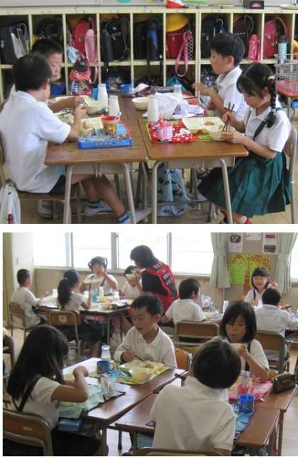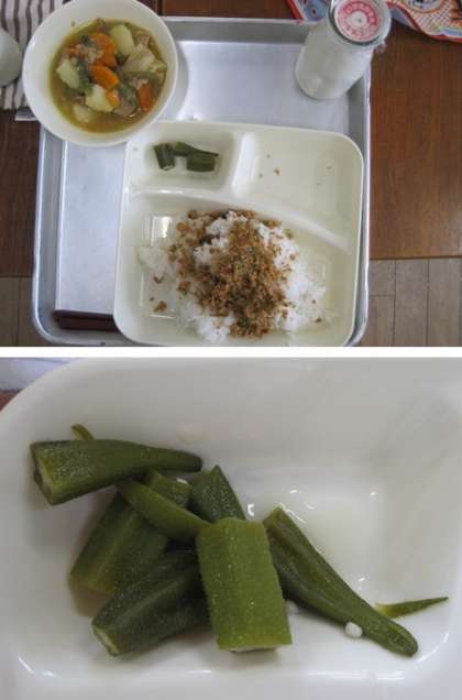 ごはんの上にのっているのは、給食室で手作りされた「紅ざけのそぼろ」です。