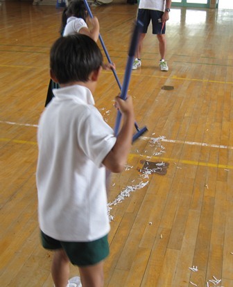 ふたりで協力してシュレッダーのゴミ(紙ごみ)を集めて、目標地点まで運び、ちりとりで取ったらゴールです。「よせて」「よせて」「よせて」「しゅー」のやりかたでみんながんばりました。