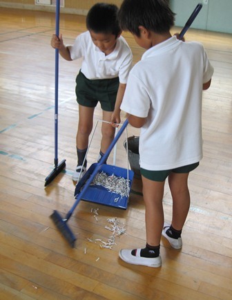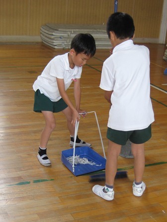 今日のそうじのとき様子を見ていると、早速、習ったことを使って、「(ゴミを)寄せようね」と相談しながらそうじしていました。