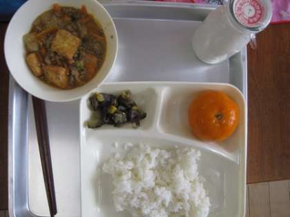 今日の給食のこんだては、夏バテ防止、見ても食べても元気いっぱい。学校給食献立コンクール優秀賞をとった献立です。