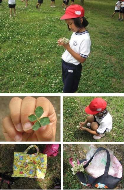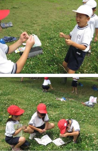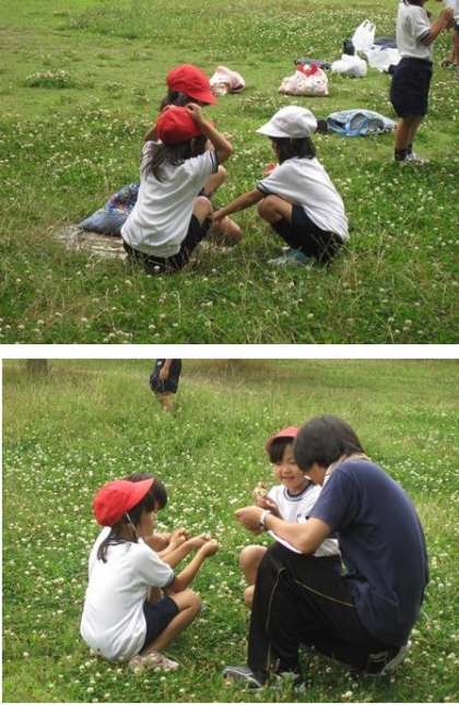 川遊びの後は、白つめくさを使って、指輪や冠を作ったりしました。