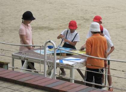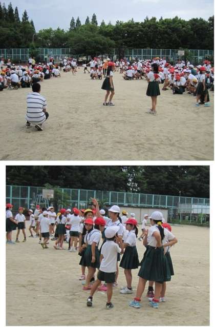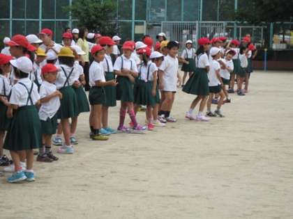 集会が終わった後、たてわり班の班旗など使ったものを片付けながら、集会についてミニの反省会をしていました。