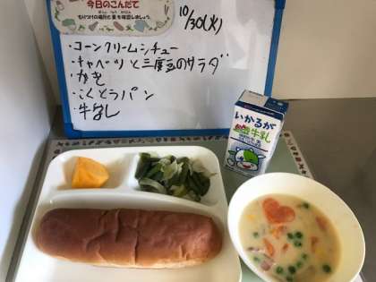今日の献立:コーンクリームシチュー(米粉)、キャベツと三度豆のサラダ、かき(平核無柿)、黒糖パン、牛乳