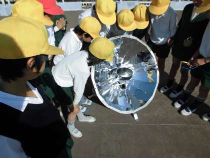 エネルギー教育の一環として、ソーラークッカーを使って日光を集めて焼き、マシュマロとお茶を楽しみました。日光のエネルギーをうまく使って省エネの学習につなげていきました。晴れた日にしかできない部分も本実践のエネルギーの特性の一部です。