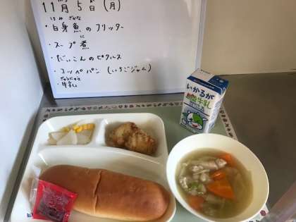 今日の献立:白身魚のフリッター、スープ煮、だいこんのピクルス、コッペパン、いちごジャム、牛乳