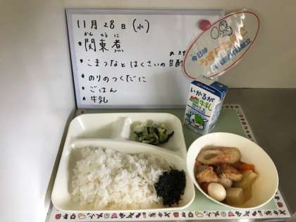 今日の献立:関東煮(うずら卵除去食)、こまつなとはくさいのあま酢あえ、のりのつくだ煮、ごはん、牛乳