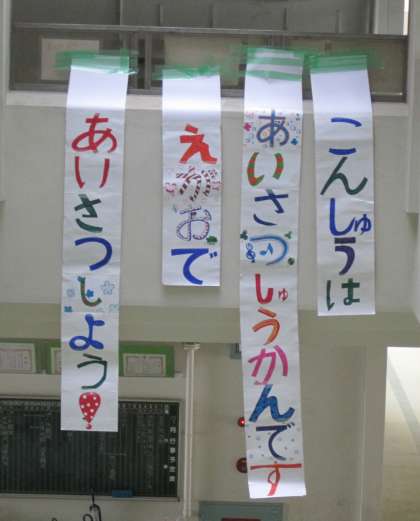 「えがおで、元気に」あいさつしましょうね。