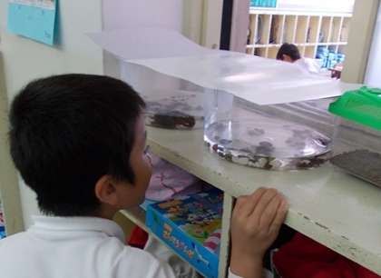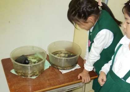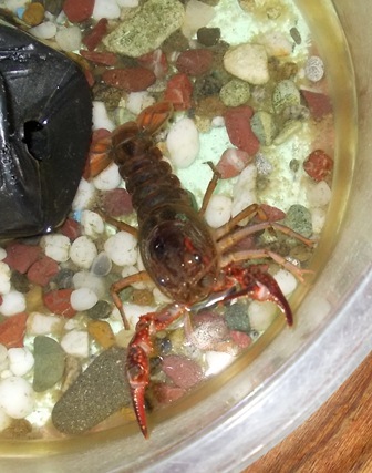 やってきたザリガニくんたちはとても元気です。子どもたちが水槽を覗きこむと大きなハサミをふりかざしています。