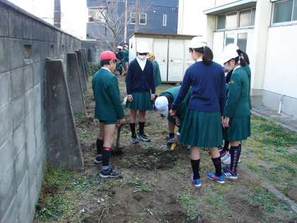 2学期に行った環境新聞の取り組みに対し、新聞社から苗木が届きました。昨日みどり小学校の緑化のために6年生で体育館の周りや運動場の周辺に植樹を行いました。