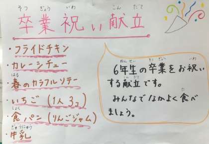 今日は6年生の卒業をお祝いする気持ちが込められた献立でした。