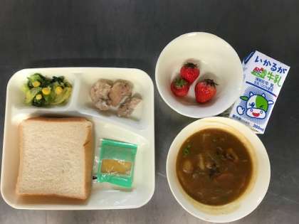 今日の献立:フライドチキン、カレーシチュー、春のカラフルソテー、いちご、食パン、りんごジャム、牛乳
