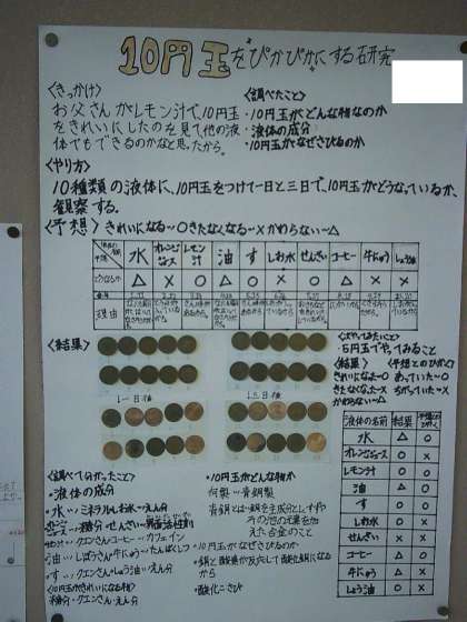 4年生では、「水をろ過する方法」「エレクトーンのしくみ」「10円玉をぴかぴかにする研究」など様々に研究を行っていました。調べたことも画用紙やレポート用紙にしっかりとまとめることができています。