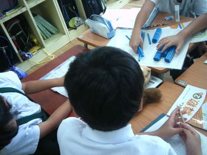 数の仕組みがよくわかるように、「数え棒」を使い、10の束と1の棒を操作しながら「くり上がり」についての理解を深めました。