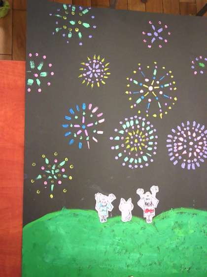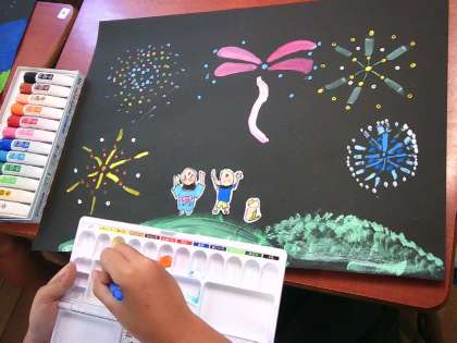 「花火を見た夜」というテーマで、黒い画用紙に絵の具で花火の模様を描きました。