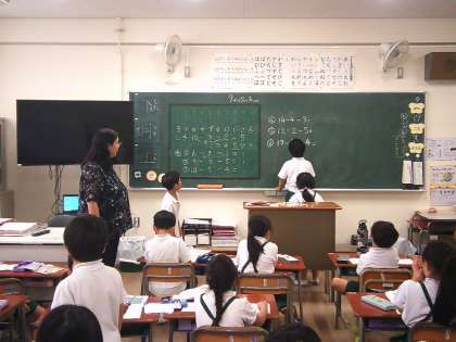 3つのかずのけいさんにチャレンジしました。黒板にでてきて解答をかいているところです。