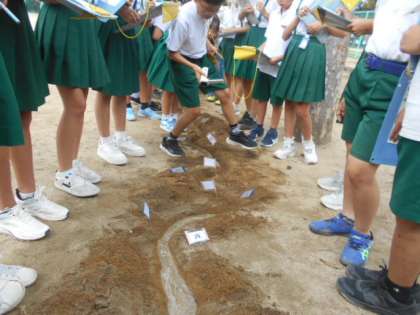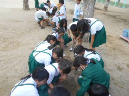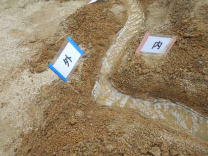 今日の学習課題は「流れるには、どんなはたらきがあるのだろうか」です。「4年生の時に、水は高いところから低いところへ流れることをなったよ。」「運動場で水を流すと、土が流されると思うよ!」「けずれる様子がわかりやすいように、くねくねしたところに水を流そう!」と、子どもたちはいろいろ話し合っています。各クラス、自分たちで考えたコースを作り、そこに水を流します。さぁ、流れる水には、どんな働きがあるのでしょうか?